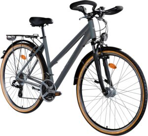 Zündapp T700 je pouzdan trekking bicikl dizajniran za žene i muškarce koji traže udobno i stabilno prijevozno sredstvo za svakodnevnu vožnju, gradske rute i rekreativne izlete. S kotačima od 28 inča i geometrijom okvira prilagođenom vozačima od 160 cm naviše, ovaj model pruža optimalnu ravnotežu udobnosti, sigurnosti i praktičnosti. Opremom je u skladu sa StVZO normama, što znači da dolazi sa svim potrebnim svjetlima i reflektorima za legalnu vožnju na njemačkim cestama.